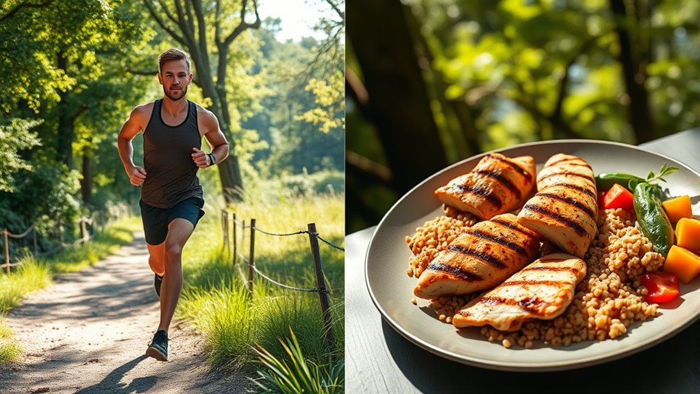 To meet your protein needs as a runner, aim for about 1.2 to 2.0 grams of protein per kilogram of body weight daily, spread across meals to support muscle repair and recovery. After running, consume protein within 30-60 minutes to jump-start muscle rebuilding and replenish glycogen, pairing it with carbs for best results. Staying well-hydrated and choosing diverse protein sources will help prevent injuries and keep you performing at your best—discover more on optimizing your nutrition.
