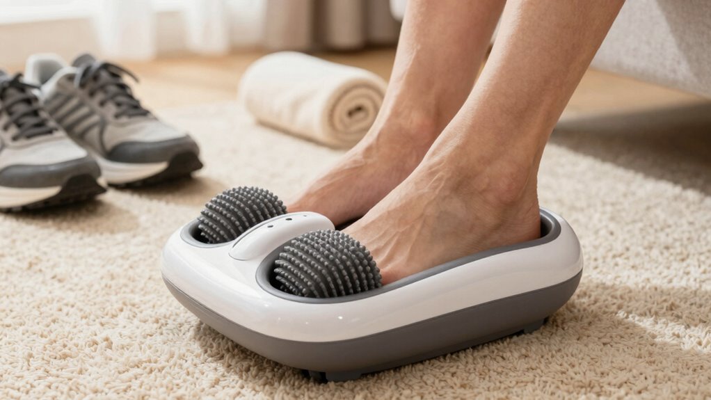 Foot massagers can’t replace professional podiatric treatment, as self-treatment has limitations. While they can provide temporary relief and improve circulation, they don’t address underlying issues like structural problems or severe pain. You should seek professional consultation for persistent or intense plantar pain. A podiatrist can diagnose the root cause and recommend appropriate treatments, ensuring you get targeted care that foot massagers simply can’t provide.