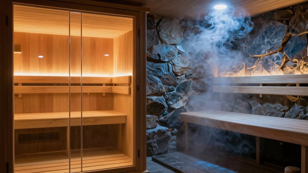 You should be aware that both infrared and steam saunas have safety concerns. Infrared saunas pose electrical safety risks if the wiring isn’t up to code or if you touch exposed components. Steam saunas can create humidity hazards, increasing the risk of mold or slipping. Always follow manufacturer instructions, guarantee proper ventilation, and avoid prolonged sessions to minimize these risks and enjoy safe, relaxing experiences.
