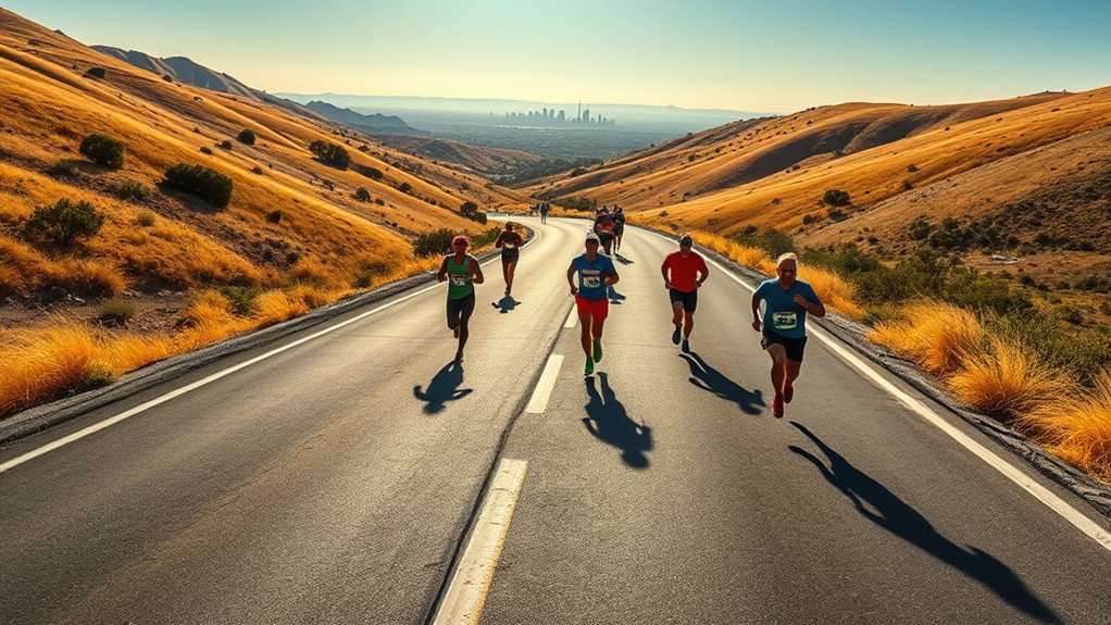 To succeed at CIM’s net downhill course, pace yourself conservatively early on and avoid rushing downhill too fast. Use the terrain to naturally pick up speed without overexerting, saving energy for flatter and uphill final miles. Hydrate consistently, taking small sips to prevent dehydration, especially during downhill sections. Utilize technology to monitor your effort levels and adjust as needed. Follow these strategies to turn the downhill advantage into a personal best—your improved approach awaits beyond this point.