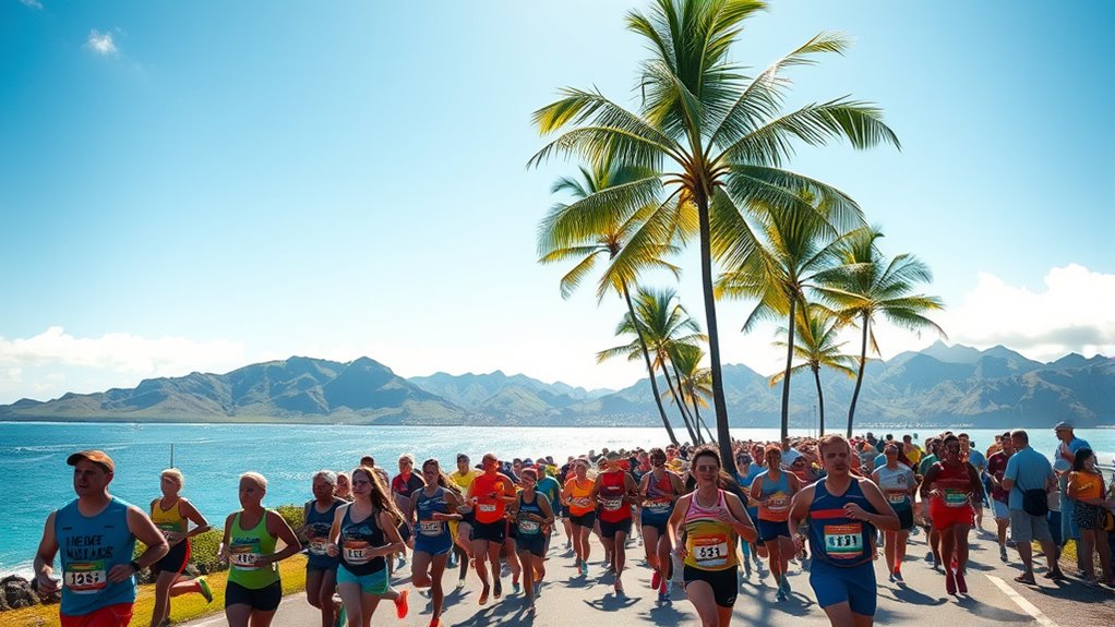 During marathon weekend, you’ll enjoy vibrant local parades and cultural festivals that celebrate Hawaiian heritage. These events often include traditional music, dance, and food, giving you a unique cultural experience beyond the race. Participating in or spectating these festivities allows you to immerse yourself in the local community’s spirit and traditions. Be sure to check the schedule in advance so you don’t miss the exciting parades and cultural festivals happening during this lively weekend.