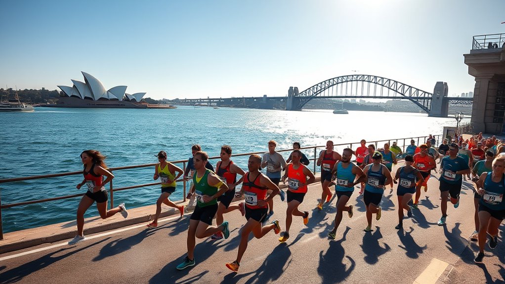 You’ll be treated to stunning harbor vistas and iconic coastal landmarks that paint a picture-perfect backdrop as you run. The race showcases sweeping views of Sydney Harbour, with the Opera House and Harbour Bridge sparkling in the sunlight. As you pass along scenic waterfronts and lush parks, the scenery truly steals the show—each mile offering a breathtaking glimpse of Sydney’s natural beauty and bustling cityscape, making every step unforgettable.