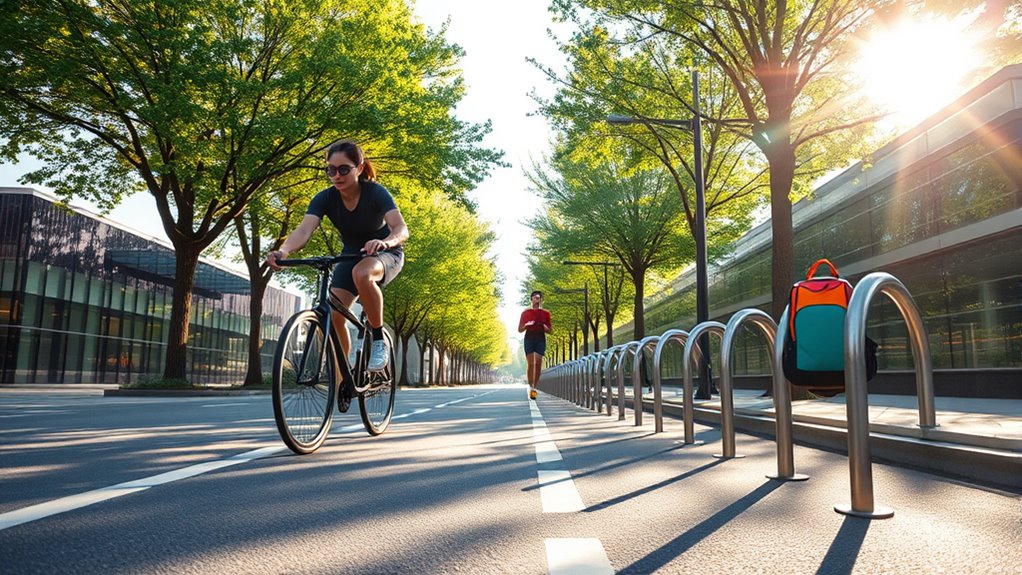 Next, route planning is vital for a smooth run commute. Start by selecting a route that minimizes traffic and hazards while offering a safe, scenic pathway. Use online maps or running apps to identify routes that are well-lit and maintain good sidewalk or trail conditions. Keep your route manageable, especially in the beginning—aim for a distance that feels doable and leaves you enough time to shower and prepare for work afterward. It’s also helpful to vary your routes to keep things interesting and prevent boredom. If possible, choose routes that connect easily to your home and workplace, saving you time and reducing the likelihood of getting lost. Consider testing out your route during non-commuting hours first, so you can familiarize yourself with the terrain and identify any potential issues. Incorporating high-quality running shoes can significantly improve comfort and reduce injury risk over long distances. Planning ahead means you won’t waste time figuring out where to go, and you’ll feel more confident tackling your run commute daily.