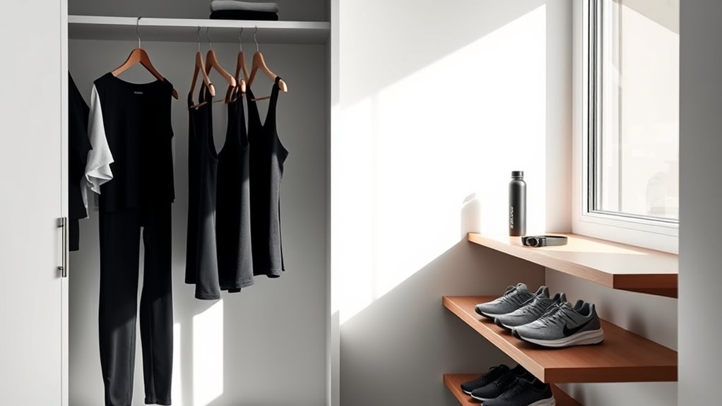 When it comes to running shoes, choose a single pair that suits most of your needs, rather than multiple specialized models. Look for versatile designs that work well on various terrains and distances. Supporting your minimalist philosophy, keep your gear simple by sticking to essential items—don’t get caught up in buying every new trend or gadget. Instead, invest in quality that lasts, and keep your kit streamlined. An efficient wardrobe reduces decision fatigue and saves you time both pre- and post-run. It also encourages you to stick to your routine because getting ready feels less chaotic. Incorporating sound healing science principles such as mindful breathing and focus can further enhance your running experience and mental clarity.