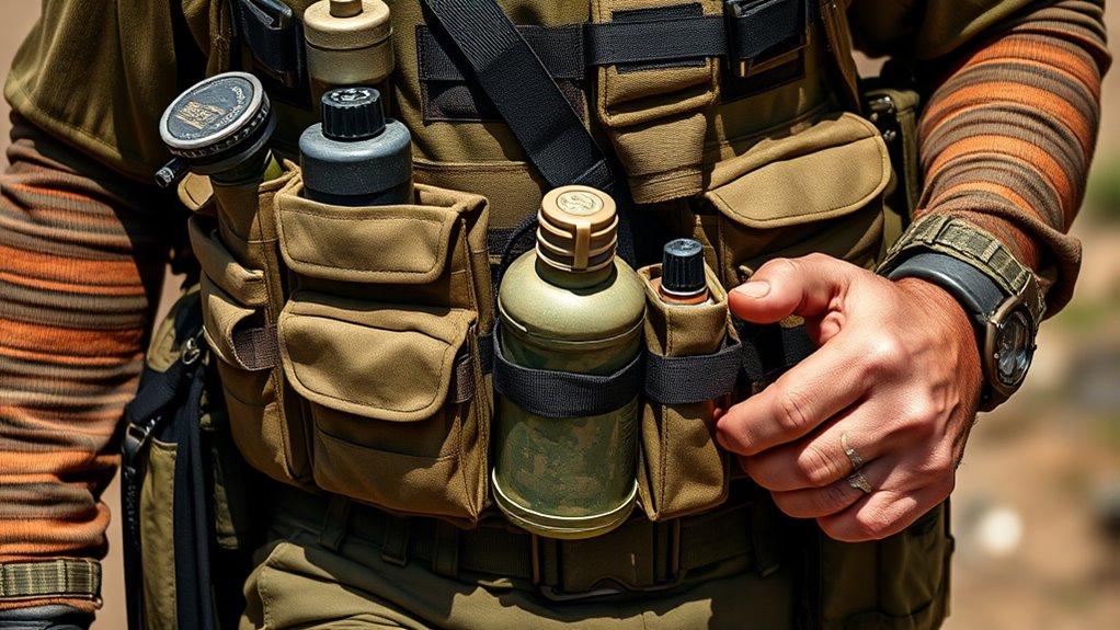 When carrying fuel on the run, use specially designed vests or belts with secure, leak-proof compartments made from durable, chemical-resistant materials. Avoid makeshift solutions like pockets or improvised containers, as they pose spills and vapor hazards. Make certain containers are snug, sealed, and properly stored in reinforced compartments to prevent leaks and accidents. Upgrading your gear to the right equipment minimizes risks and boosts safety. If you want to learn more about safe fuel transport, keep exploring these essential tips.