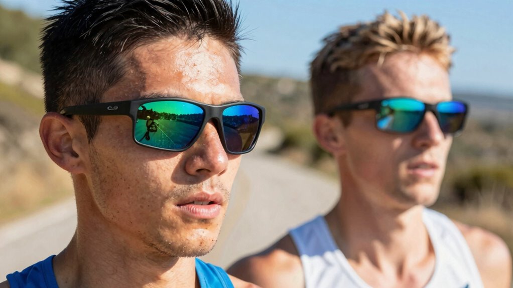 Polarized lenses can slightly affect your depth perception, especially in certain lighting conditions or when looking at reflective surfaces. You might notice reduced visual clarity of some objects or surfaces, which could impact your awareness of distances. However, for most runners, this effect is minimal and doesn’t considerably hinder performance. If you’re concerned, try different lenses to find the most comfortable option that maintains ideal depth perception and clarity.