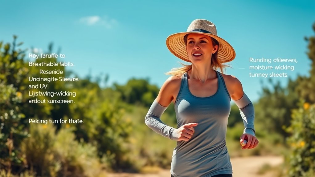To stay safe during sunny runs, wear a wide-brimmed hat or cap and UV-protective sunglasses to shield your face, neck, and eyes. Apply broad-spectrum sunscreen with SPF 30 or higher on all exposed skin, reapplying every two hours or more often if sweating. Plan your runs during cooler times or shade to minimize direct sun exposure. Incorporate hydration strategies and wear moisture-wicking clothing for comfort. Keep these tips in mind as you explore ways to protect yourself from harmful rays.