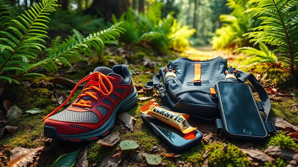 When heading out on a trail run, you should carry essentials like a water bottle or hydration pack, snacks, and a small first aid kit. Wear trail-appropriate shoes, moisture-wicking clothing, and sun protection such as sunglasses and a hat. Bring navigation tools like a map or GPS, a flashlight for low light, and a communication device for emergencies. Planning ahead and packing these items can keep you safe and comfortable—discover more to make certain you’re fully prepared.