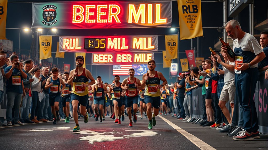 The beer mile might seem like a bizarre event, but its origins are surprisingly old and quirky. You might be surprised to learn that this peculiar race has a history trivia that dates back several decades, with roots stretching into college dorms and underground competitions. Originally, it wasn’t a formal sport but a rebellious challenge among friends, blending athleticism with a good dose of mischief. Over time, though, it evolved into a more organized event, with official rules and record-keeping. Understanding these roots gives you a deeper appreciation for how something so unconventional gained popularity worldwide.