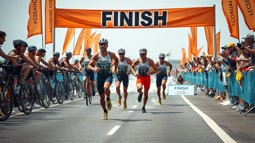 Olympic distance events are a popular and challenging format in triathlon competitions, combining swimming, cycling, and running into a single race. This race demands a well-rounded approach, where your training techniques become essential to optimize performance across all three disciplines. To excel, you need a strategic plan that balances endurance, speed, and recovery. You’ll want to incorporate interval training to boost your speed and build stamina, as well as brick workouts that simulate the transition from cycling to running. These training techniques help you adapt to the race’s unique demands, guaranteeing you conserve energy and maintain a steady pace throughout. Equally important is athlete nutrition, which plays a pivotal role in training and race day performance. Proper fueling before, during, and after workouts can markedly impact your endurance and recovery. For instance, consuming carbohydrate-rich foods and electrolyte drinks during training sessions helps replenish glycogen stores and maintain hydration, preventing fatigue and cramping. On race day, a tailored nutrition plan guarantees you have sustained energy, avoiding digestion issues or energy dips that can derail your efforts. Additionally, understanding the history of Olympic distance events**** shows how the sport has evolved to become more competitive and inclusive over time.