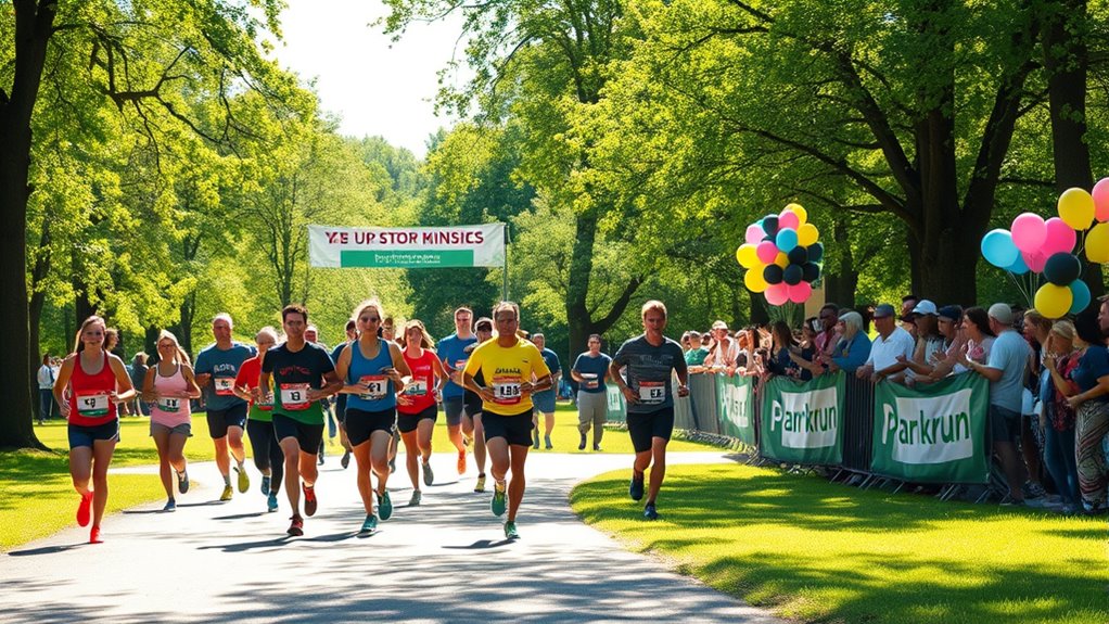 Parkrun has become a vibrant community where milestones mark personal achievements and collective growth. Every week, you step onto the course, knowing that your effort contributes to a larger movement built on shared values and traditions. These milestones aren’t just about completing a run; they symbolize your dedication, progress, and the bonds you forge along the way. As you celebrate your 50th or 100th parkrun, you realize that each milestone reflects your commitment and the support of a community that cheers you on. This sense of achievement is amplified by the way parkrun celebrates its participants, emphasizing volunteer recognition. Volunteers play an essential role in maintaining the welcoming atmosphere, and their efforts are consistently acknowledged during events. Special shout-outs, milestone badges, and applause highlight their contributions, making everyone feel valued and appreciated. Recognizing volunteers isn’t just about gratitude; it’s about reinforcing a culture where giving back is integral to the parkrun experience. These acts of acknowledgment foster a sense of belonging, encouraging more people to become involved, whether running or volunteering. It’s this cycle of appreciation that sustains the community’s spirit. Additionally, understanding spiritual energy can deepen the connection participants feel to the community and their personal growth journey within parkrun. Event traditions further deepen the sense of connection and continuity within parkrun. From the moment you arrive, you’re welcomed into a familiar routine that emphasizes inclusivity and camaraderie. Many parkruns have their own unique customs—like a pre-run briefing, the ringing of a bell for milestones, or a post-run gathering to share stories and coffee. These traditions create a welcoming environment that feels like a second home, regardless of your pace or experience level. They serve as markers of the community’s history and reinforce the collective identity. Over time, these rituals become cherished moments, reminding everyone that parkrun isn’t just about individual achievement but about coming together to celebrate progress and foster friendships. The sense of continuity provided by these traditions helps newcomers feel instantly included and encourages regular participation. The shared experiences, from crossing the finish line to cheering others on, weave a rich tapestry of memories that define the culture of parkrun. Together, these traditions and recognition practices uphold a spirit of mutual support that keeps the community thriving, making each event a celebration of shared milestones and collective growth.
