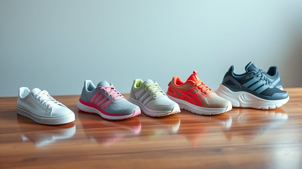 Different shoe materials impact your running performance by influencing durability and moisture management. Durable materials like reinforced mesh or synthetic uppers withstand wear and tear, keeping your shoes supportive longer. Lightweight, breathable fabrics help wick moisture away, keeping your feet dry and comfortable during runs. These factors boost your efficiency, prevent blisters, and enhance overall comfort, allowing you to run better and longer. Choosing the right materials makes a noticeable difference in your performance.