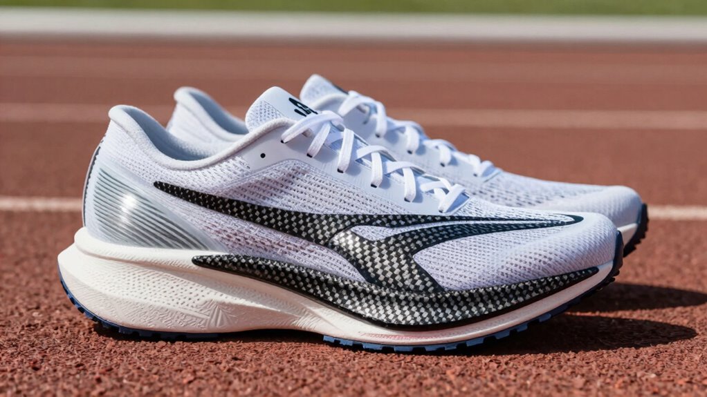 Carbon plate shoes boost your stride by making each step more responsive and efficient. The lightweight carbon fiber plate acts like a spring, propelling you forward and conserving energy during long runs. They improve your running economy, helping you run faster with less fatigue. The advanced materials also guarantee durability and consistency over many miles. If you want to understand how these shoes transform your performance and what makes them so effective, stay with us to learn more.