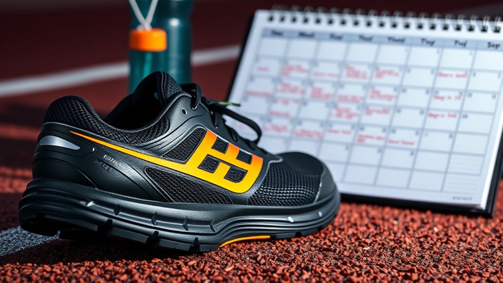 To safely increase your weekly mileage, start by adding small increments—no more than 10% per week—so your body can adapt without undue stress. Incorporate interval training into your runs to build endurance efficiently, making each session more effective without overloading your muscles. Always prioritize your footwear; regularly check the condition of your shoes and replace them when necessary. Pay attention to how your body responds to increased mileage and adjust accordingly. If you experience persistent pain, don’t ignore it; rest and seek guidance if needed. Building your mileage safely requires patience and consistency, but by combining smart training techniques like interval workouts and wearing the right shoes, you’ll enhance your performance while staying injury-free. Keep listening to your body, progress gradually, and enjoy the journey toward becoming a stronger, more resilient runner.
