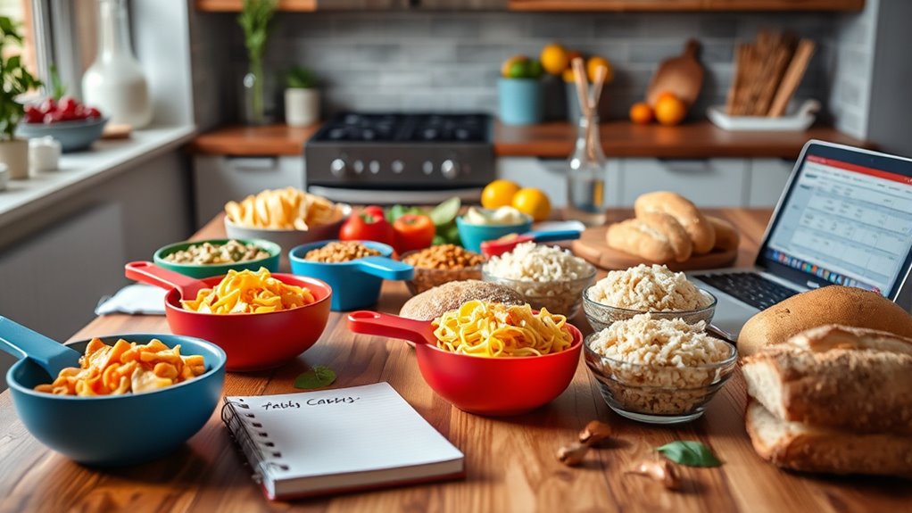 Before creating a personalized carb-loading plan, you need to evaluate your activity level and goals. Your activity level determines how much carbohydrate you’ll need to fuel your muscles effectively. If you’re engaging in high-intensity or long-duration exercise, you’ll require more carbs than someone with a moderate routine. Your goals also influence your plan—whether you’re aiming for endurance, recovery, or performance enhancement. Consider how meal timing plays a role; plan to consume carbs strategically before, during, and after workouts for ideal energy and recovery. Snack choices matter too—opt for easily digestible, nutrient-dense carbs that align with your activity schedule. Additionally, incorporating performance kits and suspension upgrades can optimize your body’s response to training, similar to how tuning a vehicle improves its overall performance. Understanding your fitness level can help you select the appropriate carbohydrate sources and portions, ensuring your plan is both effective and sustainable. Developing a creative approach to your carb intake, such as experimenting with different food combinations, can also help you discover what works best for your body. Incorporating proper storage techniques for your carbohydrate-rich foods can help maintain their freshness and nutritional value, ensuring consistent energy supply. By understanding your activity intensity and objectives, you can tailor your carb intake to maximize energy and support your training.