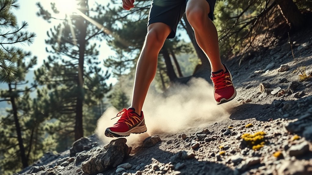 Choosing the right gear is essential for maintaining stability when running downhill. Proper gear selection helps you adapt to varying terrain and reduces the risk of slips or falls. Focus on footwear with aggressive grip and durable soles designed for terrain adaptation. Additionally, wear clothing that offers flexibility and breathability for better movement. Consider accessories like lightweight hydration packs or trekking poles for extra stability on steep descents. Good gear ensures you stay balanced, conserve energy, and prevent injury.