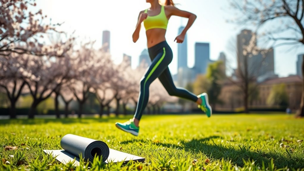When your schedule is packed but you still want to stay active, a quick 30-minute lunch-break workout can make all the difference. You don’t need a gym or fancy equipment—just a small space, some motivation, and a plan. Starting with stretch routines is essential, especially after sitting at your desk all morning. Incorporate dynamic stretches like leg swings, arm circles, and hip openers to loosen up tight muscles. These moves prepare your body for activity, improve flexibility, and reduce injury risk. You’ll feel more energized and ready to tackle the rest of your day.