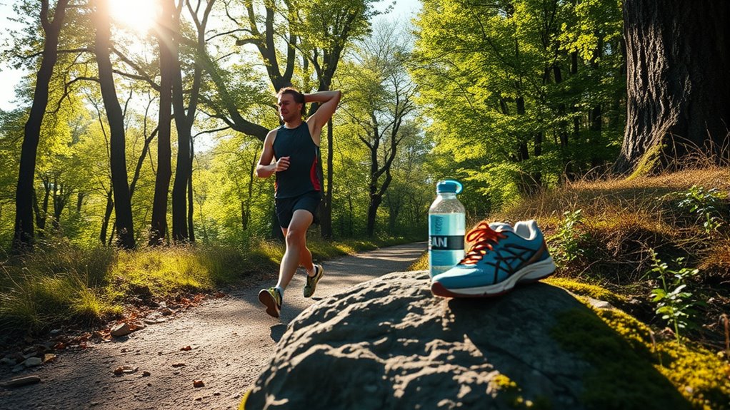 Even experienced runners can fall into common pitfalls during shakeout runs that hinder their preparation. One mistake is neglecting hydration tips, which can lead to dehydration or feeling sluggish during race day. Make sure to drink water or electrolyte drinks beforehand, but avoid overhydrating. Another error is poor gear selection; wearing new shoes or uncomfortable clothing can cause chafing or blisters. Stick to familiar, comfortable gear that you’ve tested during training. Also, avoid running too hard or pushing your pace; shakeout runs should be easy and relaxed to promote recovery. Rushing or overexerting yourself defeats the purpose. By paying attention to hydration tips and choosing the right gear, you ensure your shakeout run is effective and sets you up for race day success.