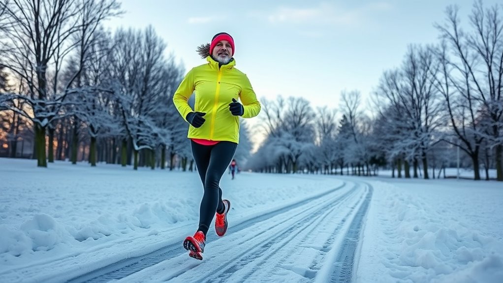 Did you know that your body loses heat 25% faster in cold air? As temperatures change, you should adjust your layers to optimize temperature regulation. If you start feeling too warm, remove a layer to prevent overheating. Conversely, add an extra layer if it gets colder. This simple approach keeps you comfortable, prevents sweat from cooling too quickly, and guarantees you stay safe and energized during your winter runs.
