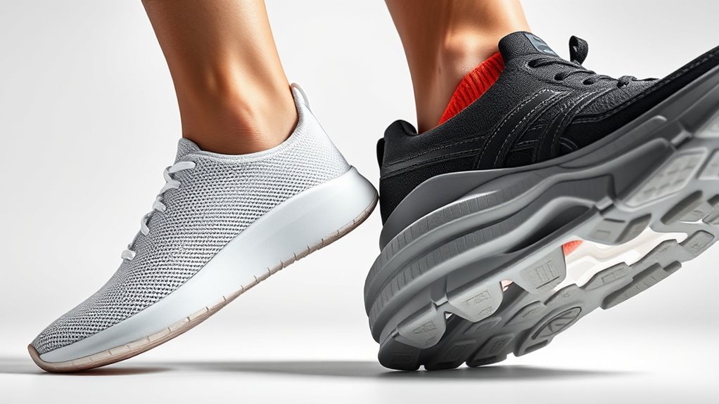 When choosing running shoes, understanding the difference between minimalist and cushioned designs can considerably impact your comfort and performance. Mechanical differences, such as arch support and heel height, play a significant role in how each type interacts with your foot during activity. Minimalist shoes typically have a low heel height, often close to the ground, which encourages a more natural foot strike. This design minimizes heel elevation, allowing your foot to land more directly beneath your body, promoting a forefoot or midfoot strike. Because of this, minimalist shoes usually offer little to no arch support, trusting your foot’s natural arch to provide stability. If you have a high arch or need additional support, this might mean you’ll need to add orthotics or select minimalist shoes with some built-in arch features. Conversely, cushioned shoes tend to have a higher heel height, which elevates the heel and provides extra shock absorption. This added height often comes with substantial arch support, helping stabilize your foot and reduce strain on the arch during runs. The increased heel height also helps distribute impact forces more evenly across your foot, which can be beneficial if you experience heel pain or have a tendency to strike heavily with your heels.