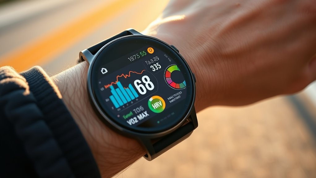 Running watch metrics like pace, heart rate, VO2 max, and HRV help you optimize your training and track progress effectively. Pace shows your speed, while heart rate keeps you in the right intensity zone. VO2 max indicates your aerobic capacity, and HRV reveals your recovery status. By understanding these key data points, you can craft smarter workouts and prevent overtraining. Keep exploring to discover how these metrics work together to boost your running performance.