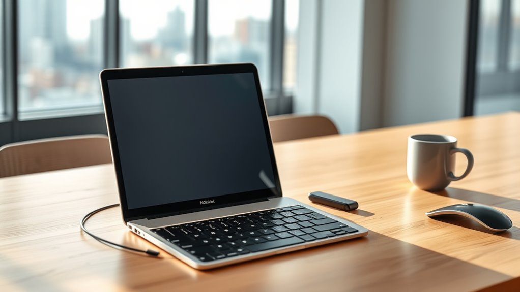 Ensuring your new 14-inch MacBook Pro works seamlessly with your existing Apple devices is essential for maximizing productivity and convenience. Compatibility opens features like iPhone Mirroring, message sharing, and FaceTime calls that streamline daily tasks. macOS on the MacBook Pro is optimized for Apple Silicon chips, ensuring smooth integration with apps like Microsoft 365 and Adobe Creative Cloud. Ecosystem compatibility also makes cross-device workflows effortless—copying and pasting between your Mac, iPhone, or iPad becomes instant. Features like AirDrop, Handoff, and Universal Control work best within Apple’s ecosystem, boosting efficiency. Plus, seamless integration with Apple services and accessories guarantees consistent performance and security, making it easier to stay connected and productive across all your devices.