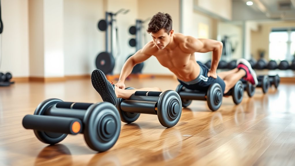Choosing an ab roller or core runner that offers superior stability and balance is essential for effective workouts and safety. A wider wheelbase, typically 3.2 inches or more, provides better ground contact, preventing wobbling and ensuring steadiness. Dual-wheel designs evenly distribute your weight, giving you more control during each roll. Non-slip surface textures on the wheels help prevent slipping on different flooring types, maintaining your balance. Handles with ergonomic, non-slip grips also improve stability by giving you a secure hold, reducing the risk of slipping or losing control. Anti-skid wheels and widened contact areas minimize side-to-side movement, making your exercises safer and more balanced. Prioritizing these features helps you perform core workouts confidently and reduces injury risk.