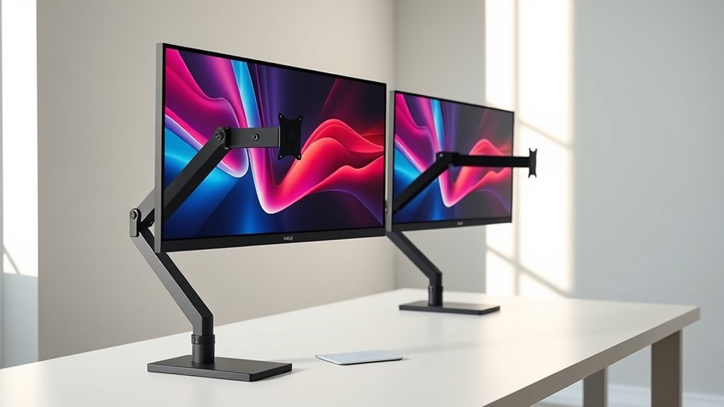 Adjustability and range are essential factors because they determine how comfortably and effectively you can position your monitors. A good arm offers tilt from -90° to +85°, letting you customize vertical angles for better ergonomics. Swivel functionality up to 180° or 360° makes it easy to switch screens or change orientations without hassle. Height adjustment capabilities vary—some models provide up to 21 inches of vertical movement, aligning monitors at eye level for comfort. Many full-motion arms incorporate gas springs or pneumatic systems, allowing smooth, tool-free modifications on the fly. The extension range, often reaching 25 inches, helps you set your monitors at the perfect distance for your workspace. Prioritizing adjustability and range ensures your dual setup is both comfortable and efficient.
