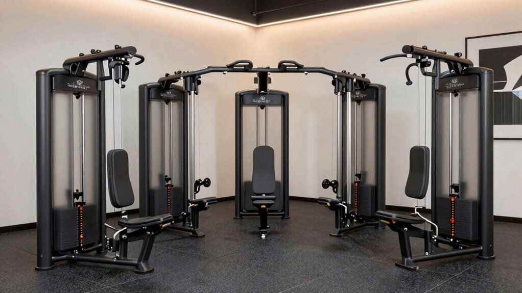 - Details versatile machines supporting multiple exercises with customizable belts, handles, and attachments.