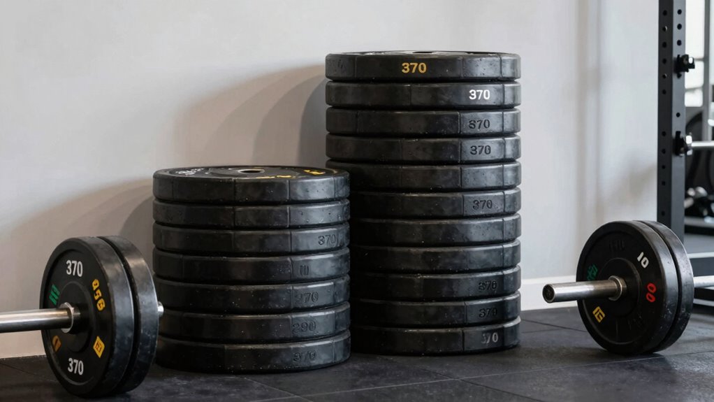 When selecting bumper plates for your 370 lb set, paying attention to noise and floor protection is essential, especially if you work out in shared or noise-sensitive spaces. Rubber bumper plates are designed to absorb shock and reduce noise during drops, helping protect floors and equipment. Thicker rubber coatings and reinforced steel inserts minimize reverberating clangs and bouncing sounds. The quality and density of the rubber directly impact how much noise is generated when plates are set down or dropped. Plates with a high durometer rating produce less impact noise, making them ideal for quieter environments. Additionally, a soft, flexible rubber surface helps disperse impact forces, preventing surface damage and ensuring your flooring stays in good condition over time.