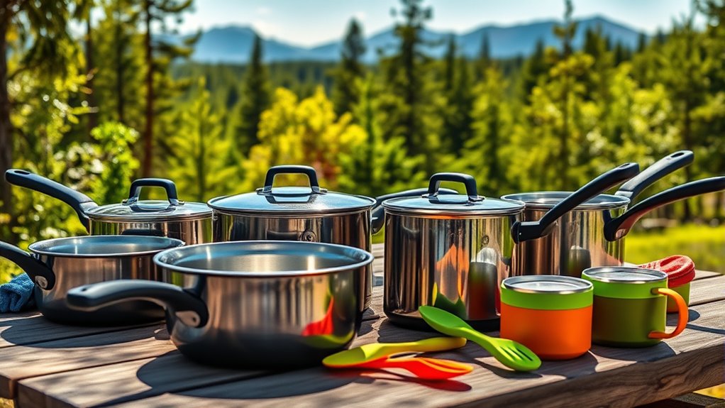 Lightweight cookware sets, often weighing under 3 pounds, are essential for backpackers aiming to reduce their load and avoid fatigue. Their compact nesting designs help save space, making packing and transport effortless in small bags or car trunks. Materials like aluminum and titanium provide high strength-to-weight ratios, guaranteeing durability without adding bulk. Foldable or insulated handles make storage easier and safer, especially during travel. Including a carrying case or mesh bag keeps all pieces organized and simplifies transport. These features help maximize efficiency, especially when every ounce counts. Choosing lightweight, compact cookware ensures you can carry everything you need without sacrificing performance, making your outdoor cooking experience more enjoyable and less burdensome.