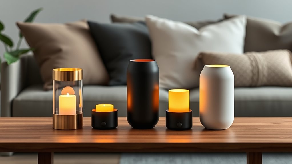 A timer function is a crucial feature to take into account because it automatically turns off the candle warmer, guaranteeing safety and preventing over-melting or burnout. Multiple timer options, like 2, 4, and 8 hours, offer flexibility for various routines. An adjustable timer allows you to customize the duration, adding an extra layer of safety by reducing forgetfulness. This feature is especially helpful for overnight use or scheduled relaxation sessions, giving peace of mind. Plus, timers help conserve energy by shutting off the device when it’s no longer needed. When choosing a candle warmer lamp, a reliable timer ensures you enjoy the ambiance without worry, making it a practical and essential feature for both safety and efficiency.