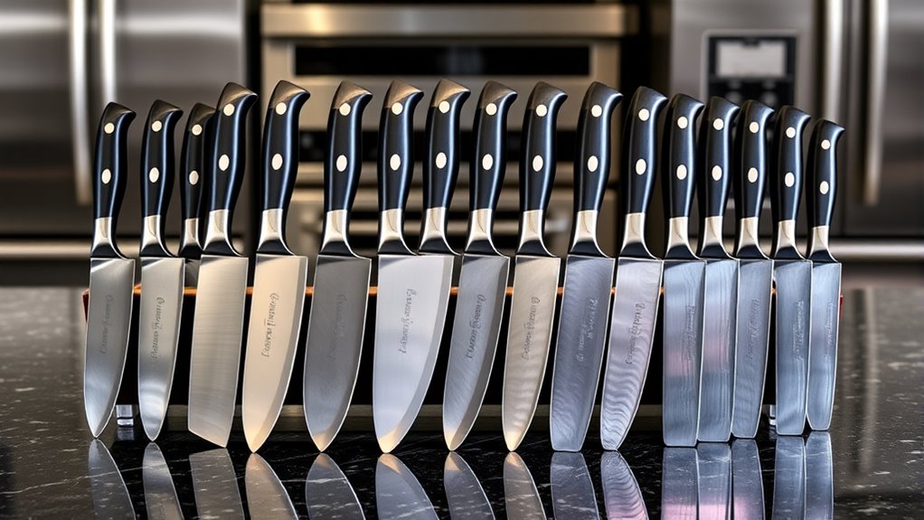 Reputable brands often come with higher price tags, but they tend to deliver more durable, high-quality knives backed by reliable warranties. These brands typically invest in strict quality control, ensuring consistent sharpness and craftsmanship across their sets. Price can often reflect material quality—premium sets usually feature high-carbon stainless steel or forged blades, which last longer and perform better. While budget options might seem appealing, they often sacrifice edge retention, handle ergonomics, or overall durability, which can hinder professional use. Choosing established brands with strong reputations offers peace of mind, better customer support, and easier access to replacements or repairs. Ultimately, investing in a trusted brand can save you money and frustration in the long run, ensuring your knives remain reliable in demanding kitchen environments.