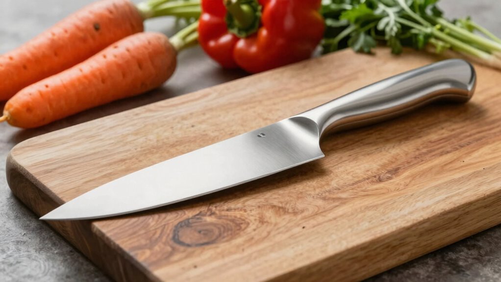 Maintaining your chef knife properly can considerably extend its lifespan and keep it performing at its best. I recommend hand washing knives with mild soap and drying immediately to prevent rust and corrosion. Regular honing with a honing rod helps realign the edge, maintaining sharpness between professional sharpenings. Periodic professional sharpening is also essential to restore the blade’s edge and guarantee precise cutting. Safe storage is vital—using a knife block, sheath, or magnetic strip prevents dulling and reduces accidents. When using your knife, opt for cutting boards made of wood or plastic, as they protect the blade’s edge better than glass or stone surfaces. Consistent care not only preserves your knife’s performance but also makes your time in the kitchen safer and more enjoyable.