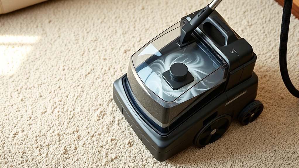Selecting the right tank capacity and size is crucial for ensuring your carpet extractor meets your cleaning needs without becoming cumbersome to handle. Larger tanks, like 10 gallons or more, let you clean longer without stopping for refills, making them ideal for extensive areas. However, they tend to be heavier and bulkier, which can make maneuvering more challenging. Smaller tanks, around 1-4 gallons, are perfect for light-duty or residential use—easier to carry and store. Dual-tank systems with separate solution and recovery tanks help prevent cross-contamination and make filling and emptying more straightforward. Keep in mind that bigger tanks add weight and size, so consider your storage space and mobility needs to find a balance between capacity and ease of use.