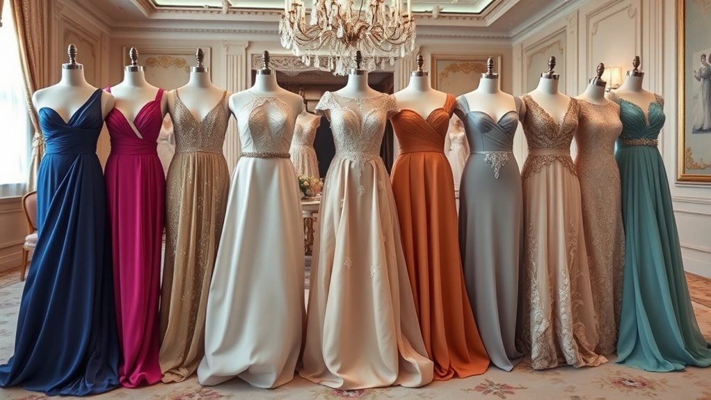 Choosing the right fabric for a designer evening gown can profoundly impact its overall look and feel. I’ve found that luxurious materials like silk, satin, chiffon, crepe, or jacquard not only exude elegance but also offer durability. While natural fibers provide a refined touch, they often demand delicate care and a higher price tag. In contrast, synthetic options like polyester and nylon are budget-friendly, wrinkle-resistant, and easy to maintain, though they may lack breathability. It’s also vital to take into account the fabric’s weight and texture, as these factors determine how the gown drapes and its comfort across different seasons. Ultimately, selecting the right fabric will enhance your gown’s appeal and guarantee you feel fabulous.