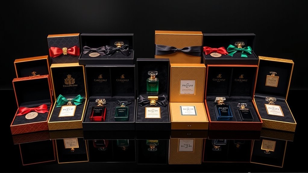 Selecting the right designer fragrance gift box involves more than just picking a scent you like; it’s about guaranteeing the fragrances suit the occasion and the recipient’s style. I consider whether the fragrances are appropriate for the recipient’s age and the event, choosing light florals for daytime or casual settings, and richer scents for evening or formal occasions. It’s also essential to match the scent profiles to the event—fresh for spring and summer, warm and spicy for fall and winter. I look at whether the set offers versatility across multiple occasions or is tailored for a specific celebration, like an anniversary or birthday. Ultimately, I ensure the fragrances have cultural or personal significance, enhancing the emotional impact of the gift.