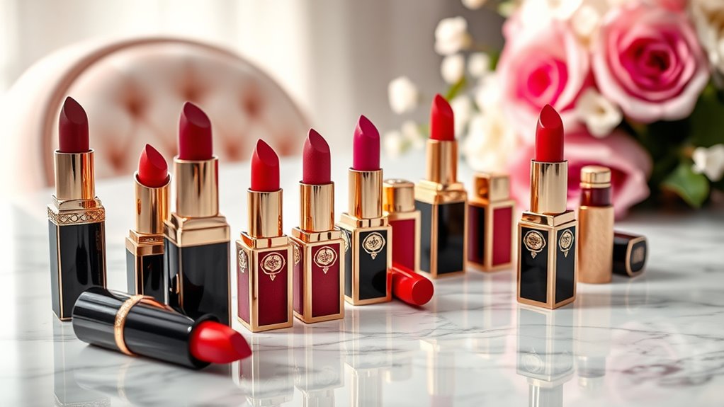 Designer lipstick collections offer a fascinating range of finish types, and knowing which one to pick can elevate your look. If you’re after a bold statement, matte finishes provide a velvety, non-reflective surface that’s long-lasting and smudge-proof. For a more youthful vibe, glossy finishes deliver high shine and hydration, enhancing your lips’ natural plumpness. If you want something in between, satin finishes strike that perfect balance, offering a soft sheen with comfortable wear. Don’t overlook shimmer and metallic options, which incorporate reflective particles for a radiant, eye-catching effect—perfect for festive occasions. With so many choices, you can easily find a finish that complements your style and mood. Choose wisely, and let your lips do the talking!