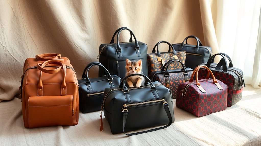 Having guaranteed comfort and ventilation for my pet, I now turn my attention to the design and aesthetic appeal of a carrier. I love choosing stylish materials like faux leather or high-quality PU leather that resemble chic handbags. The overall design should balance functionality with elegance, featuring sleek lines and subtle branding that complements my style. I appreciate a range of colors and decorative details, such as embroidery or metallic accents, which enhance the carrier’s fashionable look. The shape often mimics everyday accessories, making it perfect for any occasion, whether casual or formal. A well-designed carrier not only attracts attention but also serves as a stylish accessory, proving that pet carriers can be both functional and fashionable.