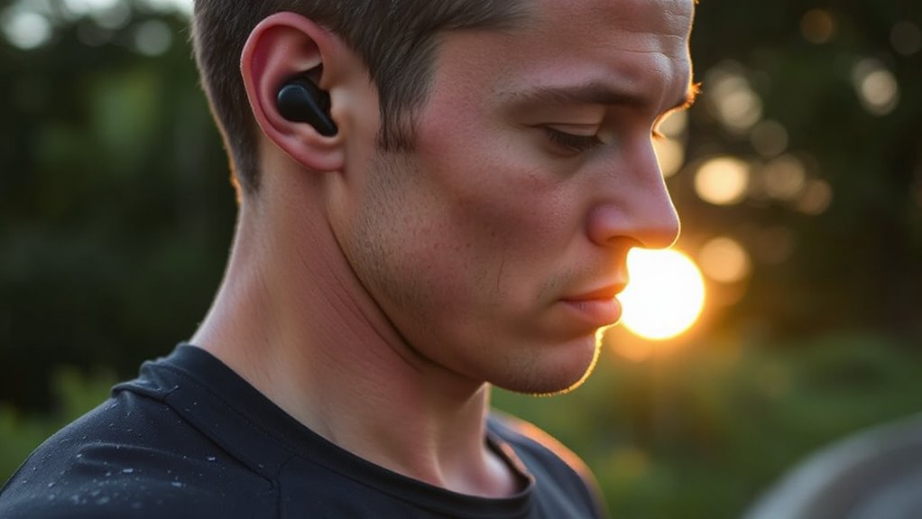 Waterproof features are essential for earbuds used in marathon training and long runs because they protect against moisture exposure that can damage internal components. An IPX7 rating means earbuds can handle sweat, rain, and accidental splashes, making them perfect for outdoor activities. These earbuds can even be submerged in water up to 1 meter for 30 minutes, ensuring durability in wet conditions. Water-resistant designs typically have sealed structures that prevent water from reaching sensitive electronics, boosting longevity. Choosing waterproof earbuds gives me peace of mind, knowing my investment can withstand the elements during intense workouts. No matter the weather, I can focus on my run without worrying about moisture ruining my earbuds, making waterproof features a non-negotiable factor for long-distance training.