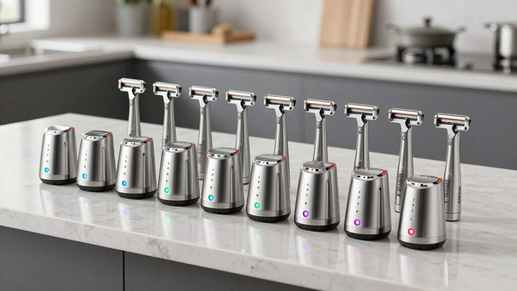 Choosing the right electric knife sharpener depends heavily on the type of sharpening technology it employs, as each method offers distinct advantages. Diamond abrasives are incredibly hard and efficient, providing quick, consistent sharpening with minimal effort, making them ideal for tough or heavily worn blades. Ceramic wheels produce smooth, burr-free edges perfect for fine polishing and maintaining blade longevity. Abrasive belt systems adapt to the blade’s edge, offering versatile sharpening for different knife types, including serrated and straight edges. The technology used impacts speed, precision, and suitability for various materials, influencing overall performance. Understanding these differences helps you select a sharpener that matches your needs, whether you prioritize speed, precision, or versatility in maintaining your knives’ sharpness.
