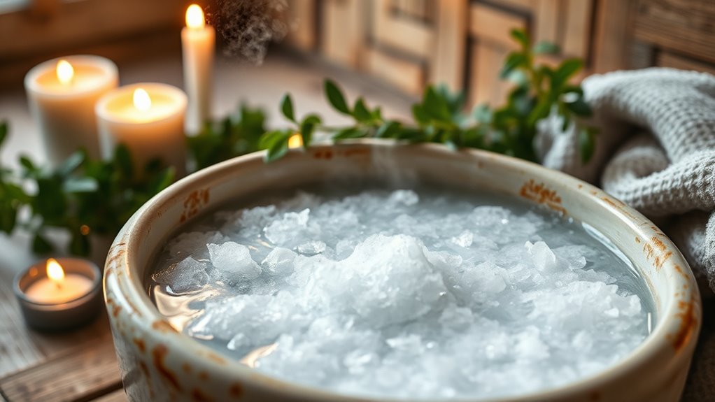 Selecting an Epsom salt soak isn’t just about purity; the scent and aromatherapy options can substantially enhance your experience. Infused salts with essential oils like lavender, eucalyptus, or peppermint promote either relaxation or invigoration, transforming your bath into a sensory retreat. The scent strength varies—from subtle hints to long-lasting, potent fragrances—allowing you to choose based on your mood or preference. Scents like lavender or chamomile are especially great for winding down before sleep, while invigorating aromas can energize you afterward. If you have sensitivities, fragrance-free options are available for a natural mineral soak without added scents. Ultimately, the right aroma can elevate your bath from routine to spa-like, nourishing your mind and body simultaneously.
