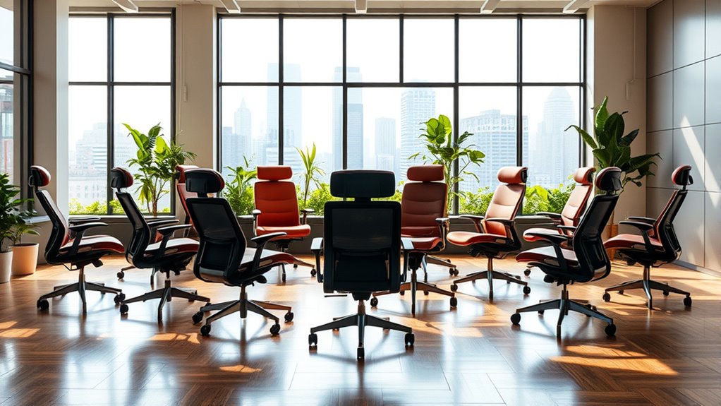Selecting the right ergonomic office chair is essential, especially since support for different body types can greatly impact your comfort and productivity. I’ve found that adjustable lumbar support is indispensable, as it caters to various spinal curvatures and reduces lower back strain. For larger or taller users, chairs with higher weight capacities, reinforced frames, and wider seats are critical for comfort and durability. It’s also important to look for adjustable armrests, seat height, and backrest angles to promote a neutral sitting posture. If you’re petite or shorter, opt for chairs with lower seat height ranges and smaller backrest dimensions to maintain proper alignment. Customizable features ensure that the chair fits your unique body shape, promoting long-term comfort and reducing fatigue.