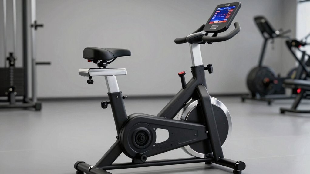 Safety features are vital for heavy-duty exercise bikes, especially for heavier riders like myself. I look for sturdy frames with reinforced construction and a high weight capacity to prevent accidents. Non-slip pedals and adjustable straps keep my feet secure, while a reliable braking system ensures safe stopping. A well-designed seat with proper cushioning and stability features also help prevent injuries. These features give me confidence and guarantee a safe workout every time.