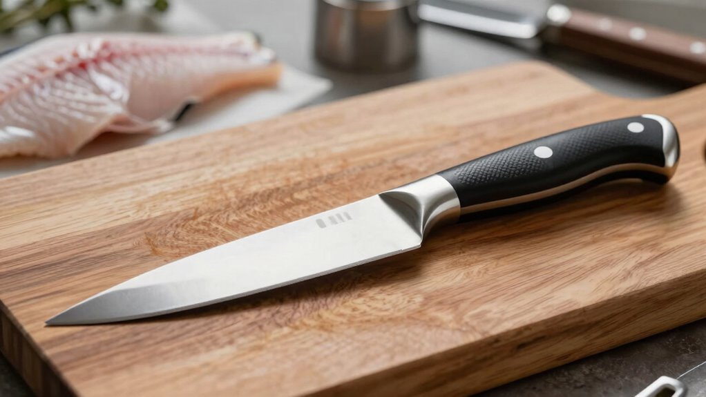 A well-designed ergonomic handle plays a crucial role in guaranteeing comfort and control during filleting. It promotes natural wrist and finger positioning, reducing hand fatigue during extended tasks. Handles with textured surfaces provide a secure, non-slip grip, even when wet, boosting safety and precision. Durable materials like pakkawood or high-quality polymers not only withstand moisture but also ensure long-lasting comfort. Proper handle design minimizes strain on the wrist and forearm, making slicing easier and more accurate with less effort. An ergonomic handle also enhances safety by lowering the risk of slips and accidental cuts. When choosing a fillet knife, prioritize a handle that fits well in your hand, feels comfortable over long periods, and offers a secure grip for confident, controlled filleting.