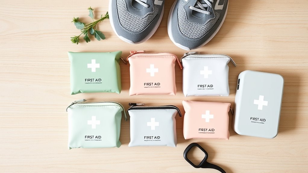 If you’re looking for the best minimalist first-aid kit for runners, I recommend options like the compact Pocket-Aid Mini, TSA-approved travel kits, or water-resistant cases that fit easily into your belt or running pack. These kits contain essentials like bandages, antiseptics, and ice packs, perfect for quick fixes on the go. Keep in mind size, organization, and durability. Stick with me to discover the top picks tailored for active runners who want to stay prepared.