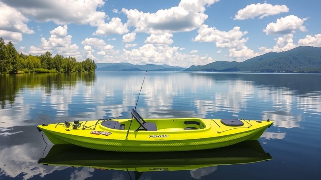 Stability and balance are essential factors to contemplate when selecting a fishing kayak because they directly impact your safety and comfort on the water. A kayak with a wide hull or flat bottom offers greater stability, making it easier to stand or move around while fishing. Multiple chine lines and a low center of gravity help distribute weight evenly, boosting overall balance. Kayaks with tunnel or W-shaped hulls provide exceptional stability, especially in calm waters and when casting. Features like adjustable seat height and footrests can also enhance balance by allowing you to customize your position for better control. Ultimately, stability measures how well a kayak resists tipping during movements like reeling in fish or shifting weight, which is critical to a safe and enjoyable fishing experience.