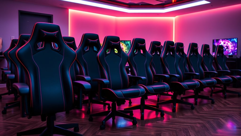 Choosing a gaming chair with the right ergonomic features is essential for maintaining comfort and preventing back pain during long gaming sessions. Look for chairs with adjustable lumbar support that contours to your natural spinal curves, which helps reduce lower back strain. The design should include a contoured backrest with segmented support zones, promoting proper posture and pressure relief. Many ergonomic chairs come with adjustable lumbar pillows or built-in support systems you can reposition for personalized comfort. Proper ergonomic design ensures the lumbar support stays in contact with your lower back in various sitting positions, preventing slouching. These features not only enhance immediate comfort but also protect your spinal health over time, making them a crucial consideration when choosing a gaming chair.