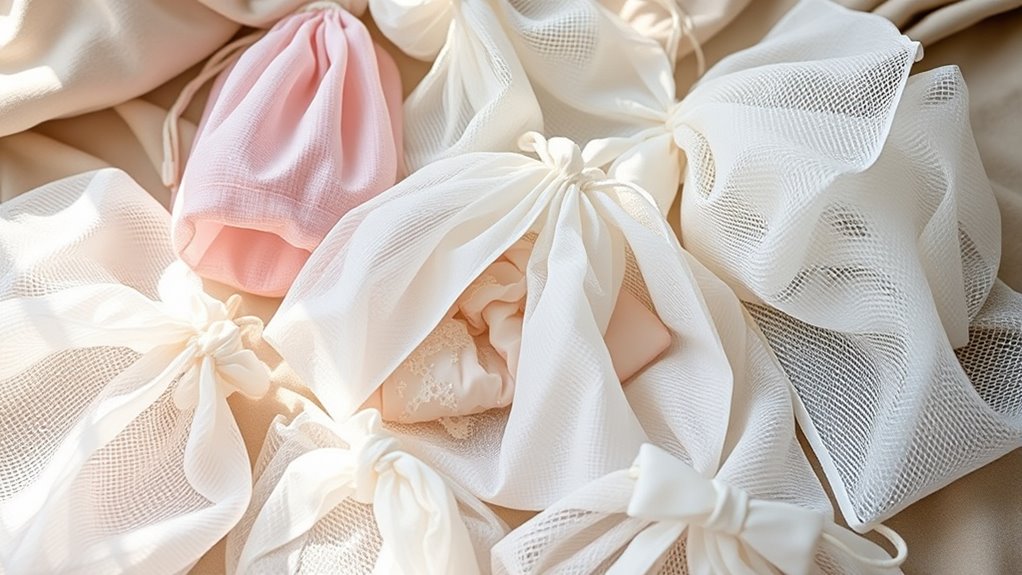 When it comes to mesh laundry bags, breathability and ventilation play a vital role in keeping delicate items in top condition. Proper airflow ensures water and air circulate efficiently, aiding in thorough cleaning and gentle drying. Mesh fabrics with fine, aerated patterns enhance ventilation, preventing moisture buildup that can lead to mold or unpleasant odors. High-quality mesh materials with good airflow help reduce drying times, which is essential for delicate fabrics that need gentle, even drying. Adequate ventilation also minimizes the risk of fabric pilling and damage caused by trapped heat and humidity during washing and drying. Overall, choosing a mesh laundry bag with excellent breathability helps maintain your garments’ integrity and prolongs their lifespan.