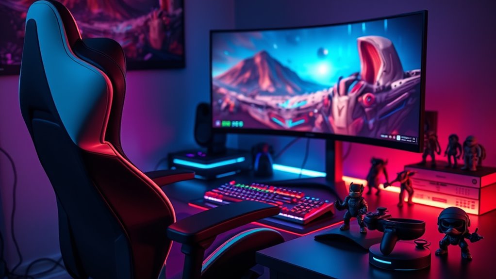 Understanding a gamer’s personal style is essential because it guarantees the gifts you select truly resonate with their preferences. Knowing whether they favor consoles, PC, or mobile helps you pick accessories suited to their setup. Recognizing their favorite genres, like action or simulation, allows you to choose items that enhance their preferred gameplay. If they enjoy competitive play, consider gifts like high-quality headsets or pro controllers; for casual gamers, fun or comfort-focused gear works better. Observing their engagement level—whether they’re casual players or streamers—guides you toward tech and merchandise that match their involvement. Ultimately, understanding if they prefer solo, multiplayer, or co-op gaming helps tailor gifts that support their preferred gaming interactions, making your gift meaningful and truly appreciated.